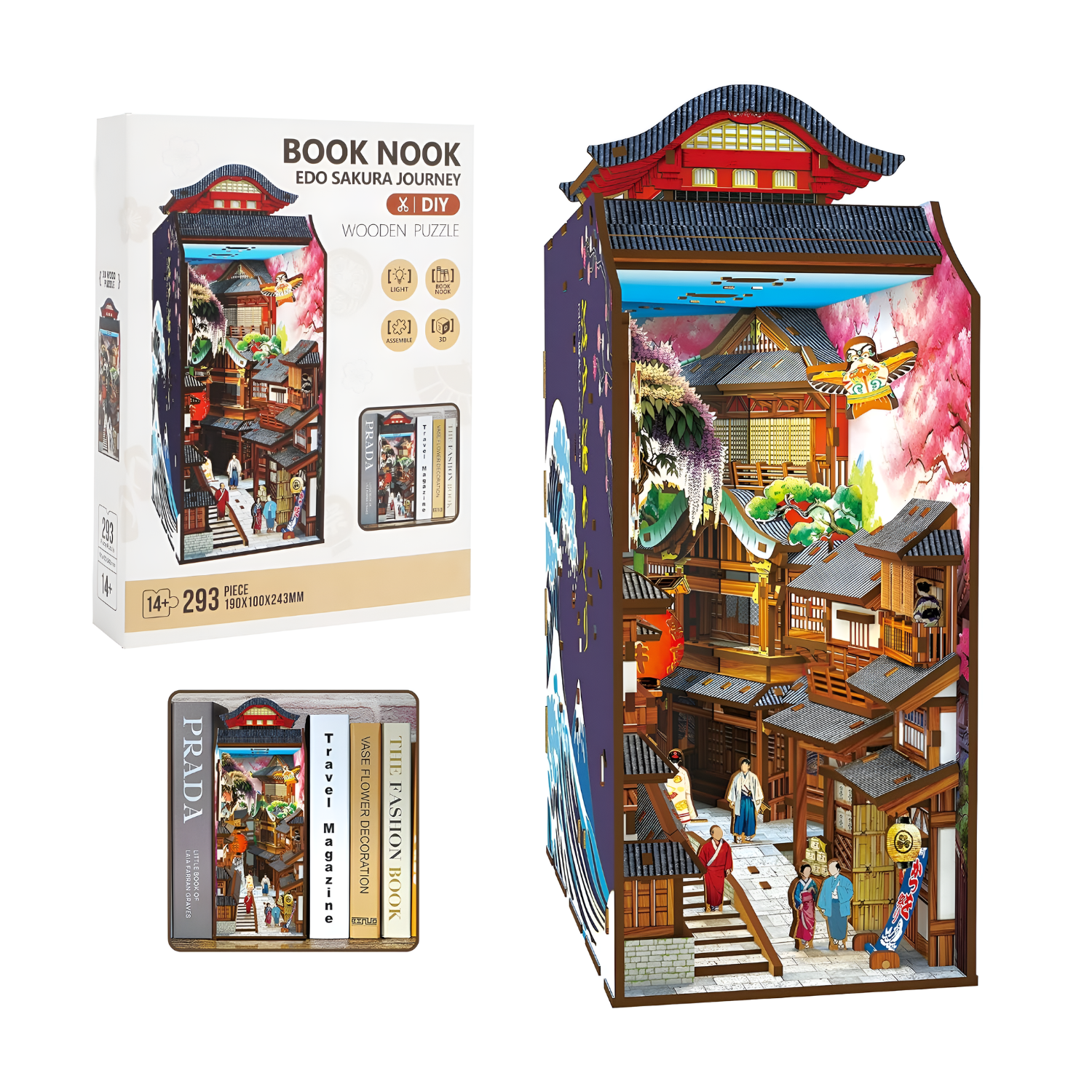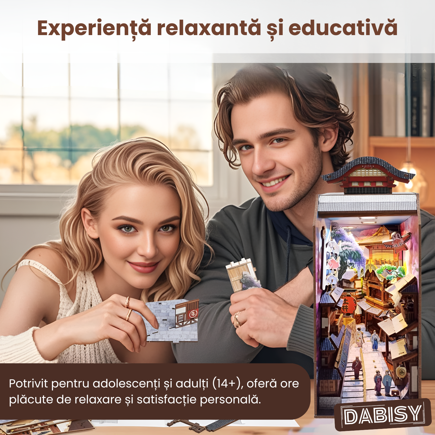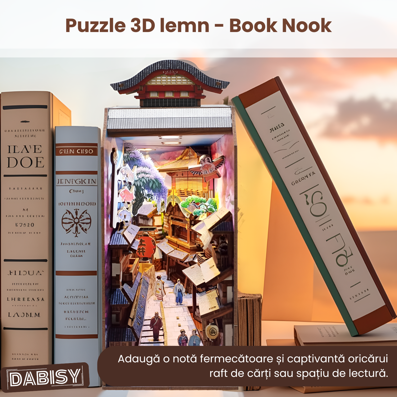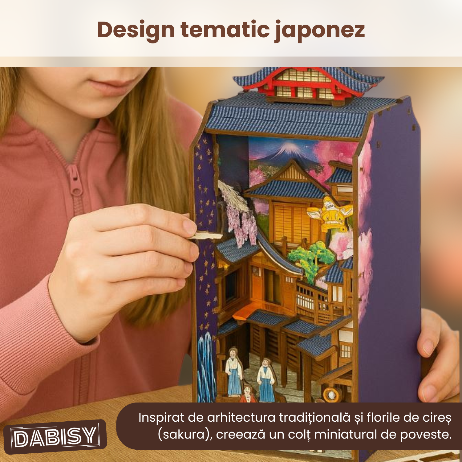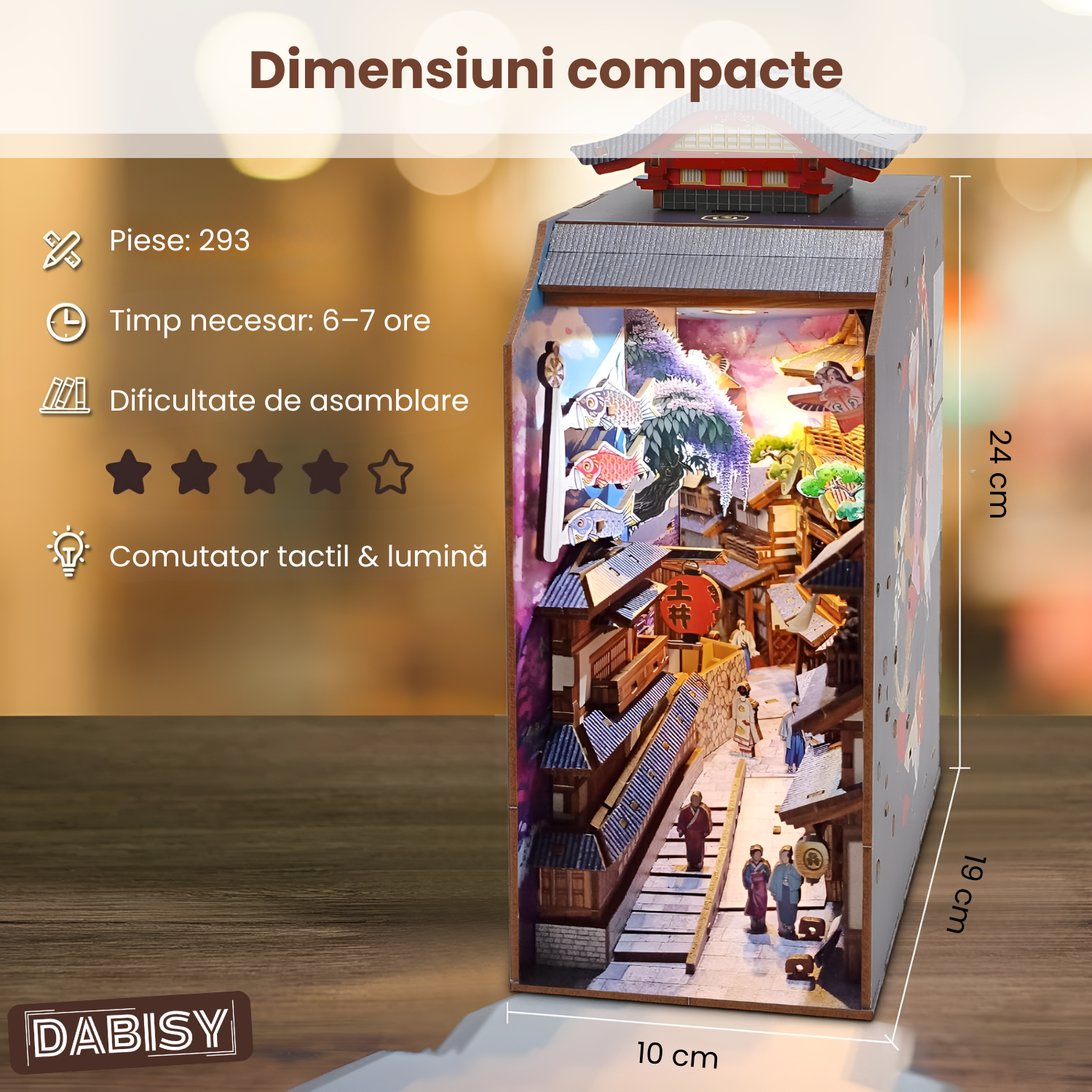 Transforma raftul tau de carti intr-o scena magica in miniatura cu acest Book Nook DIY. Inspirat din strazile traditionale japoneze, kitul include 293 de piese din lemn, pre-taiate cu precizie, si un sistem LED tactil pentru iluminare ambientala. Decorul este completat de ciresi infloriti, pesti koinobori, felinare rosii si personaje japoneze, toate asezate intr-o perspectiva spectaculoasa 3D. Fiecare detaliu contribuie la o experienta de relaxare si satisfactie, oferind in final un decor unic pentru biblioteca sau birou.
