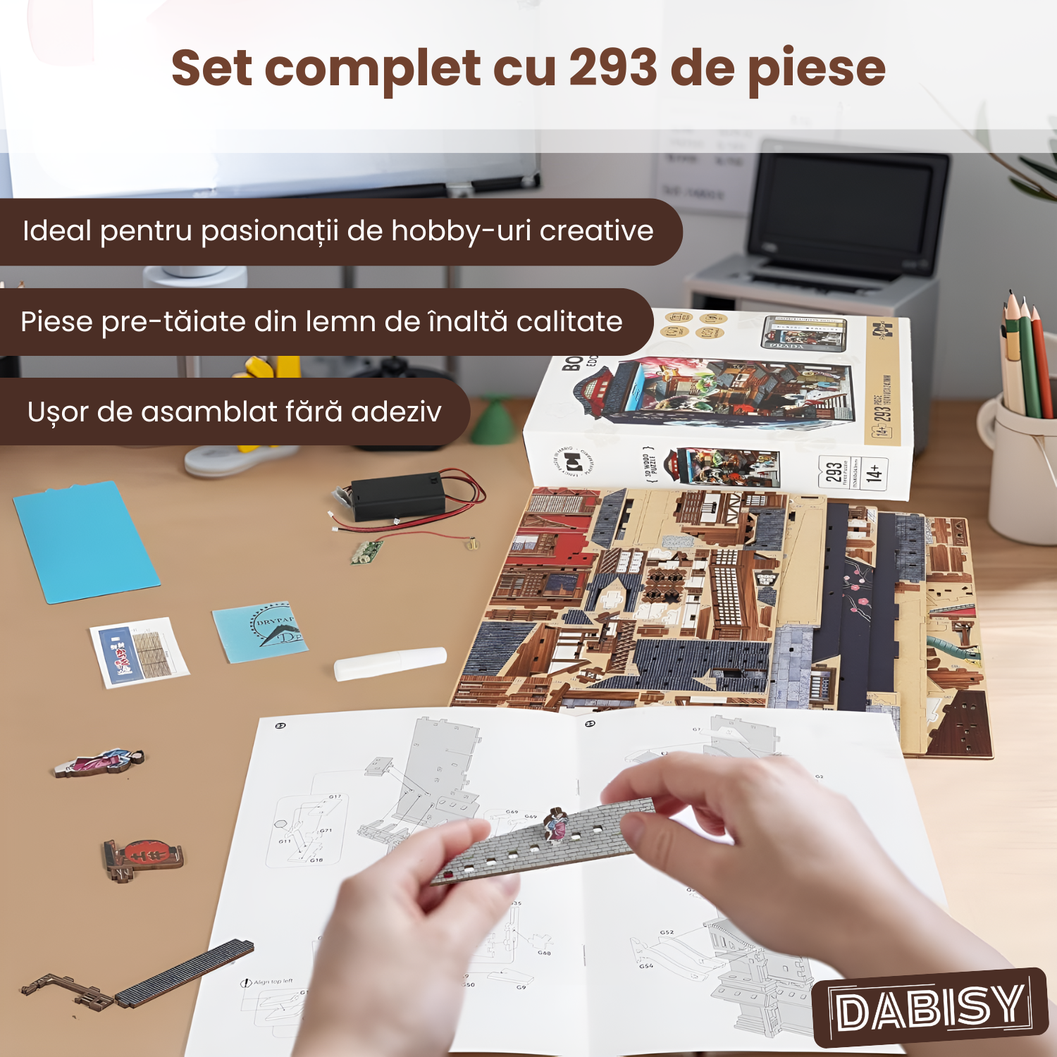 Kit DIY 3D din lemn: Set complet cu 293 de piese pre-taiate, usor de asamblat fara adeziv, ideal pentru pasionatii de hobby-uri creative si decor manual.