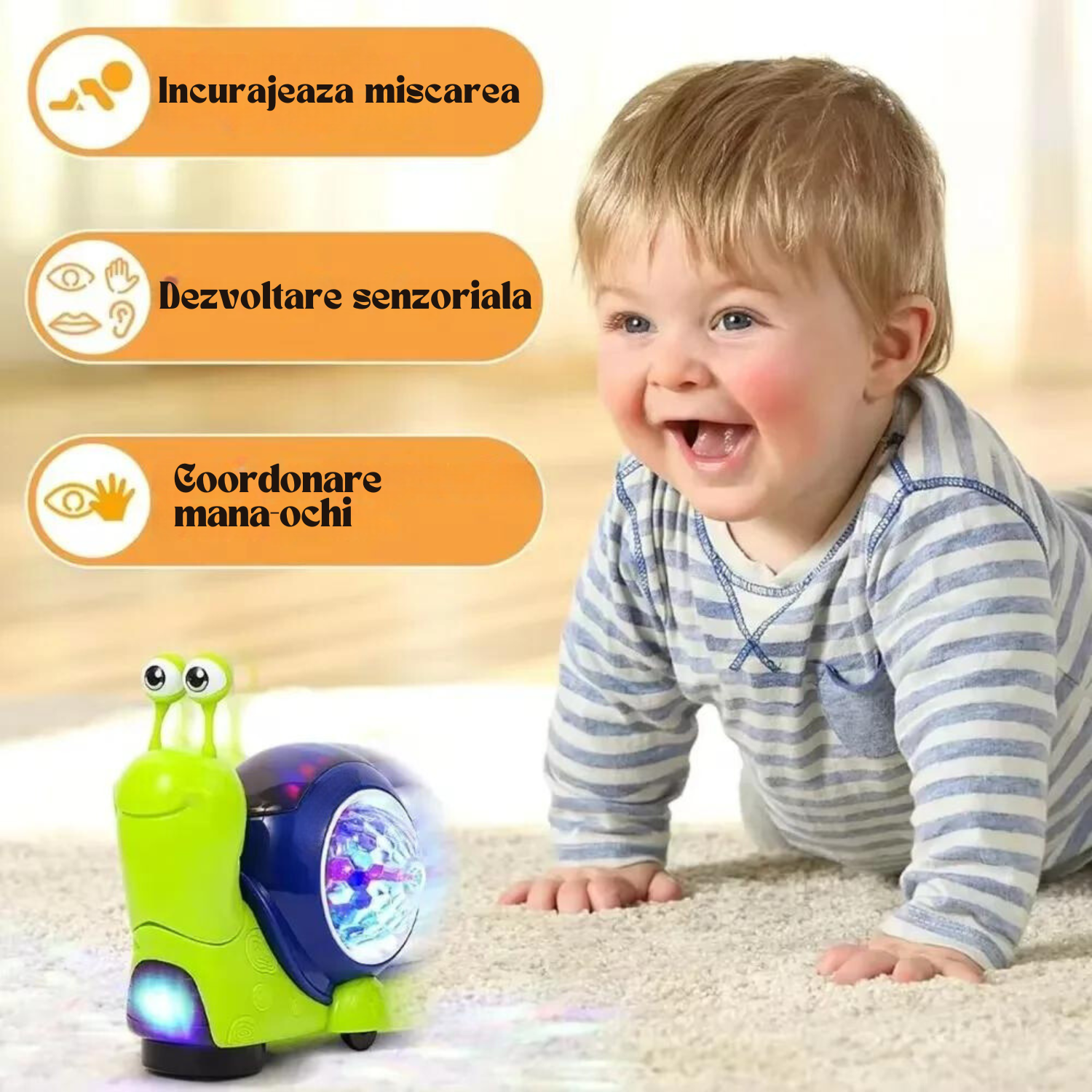 Stimuleaza dezvoltarea timpurie a copilului: Designul simpatic al melcului incurajeaza bebelusii sa se tarasca dupa el, ajutand la dezvoltarea coordonarii mana - ochi si la recunoasterea animalelor.
