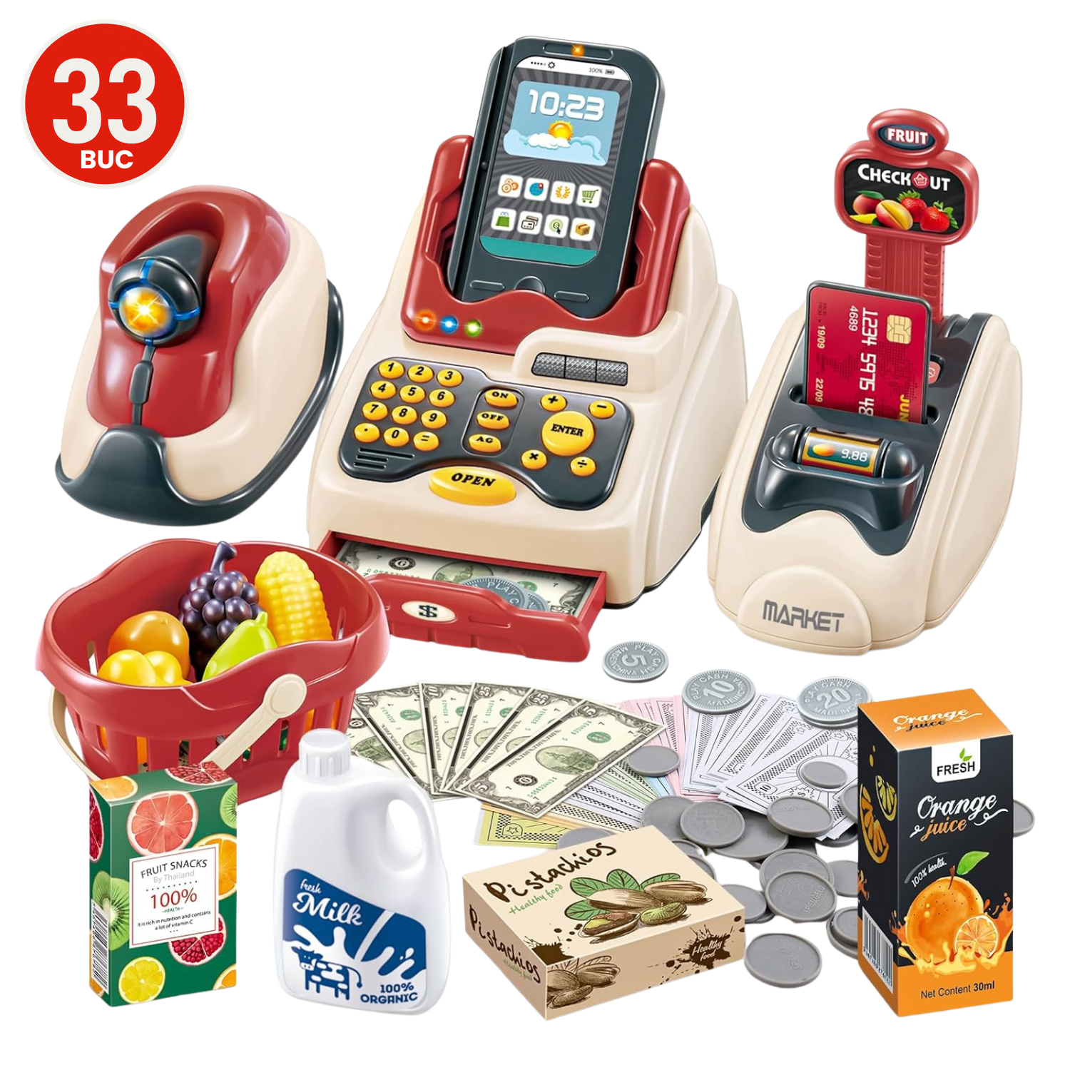 Acest set de joaca tip magazin transforma orice camera intr-un mic loc de joaca interactiv. Copiii pot simula cumparaturi reale: aleg produse, le scaneaza, calculeaza totalul si platesc cu bani sau card. Setul contine 33 de piese, inclusiv casa de marcat interactiva, scanner cu sunete si lumini, terminal de card, bani fictivi, produse alimentare si cos de cumparaturi.