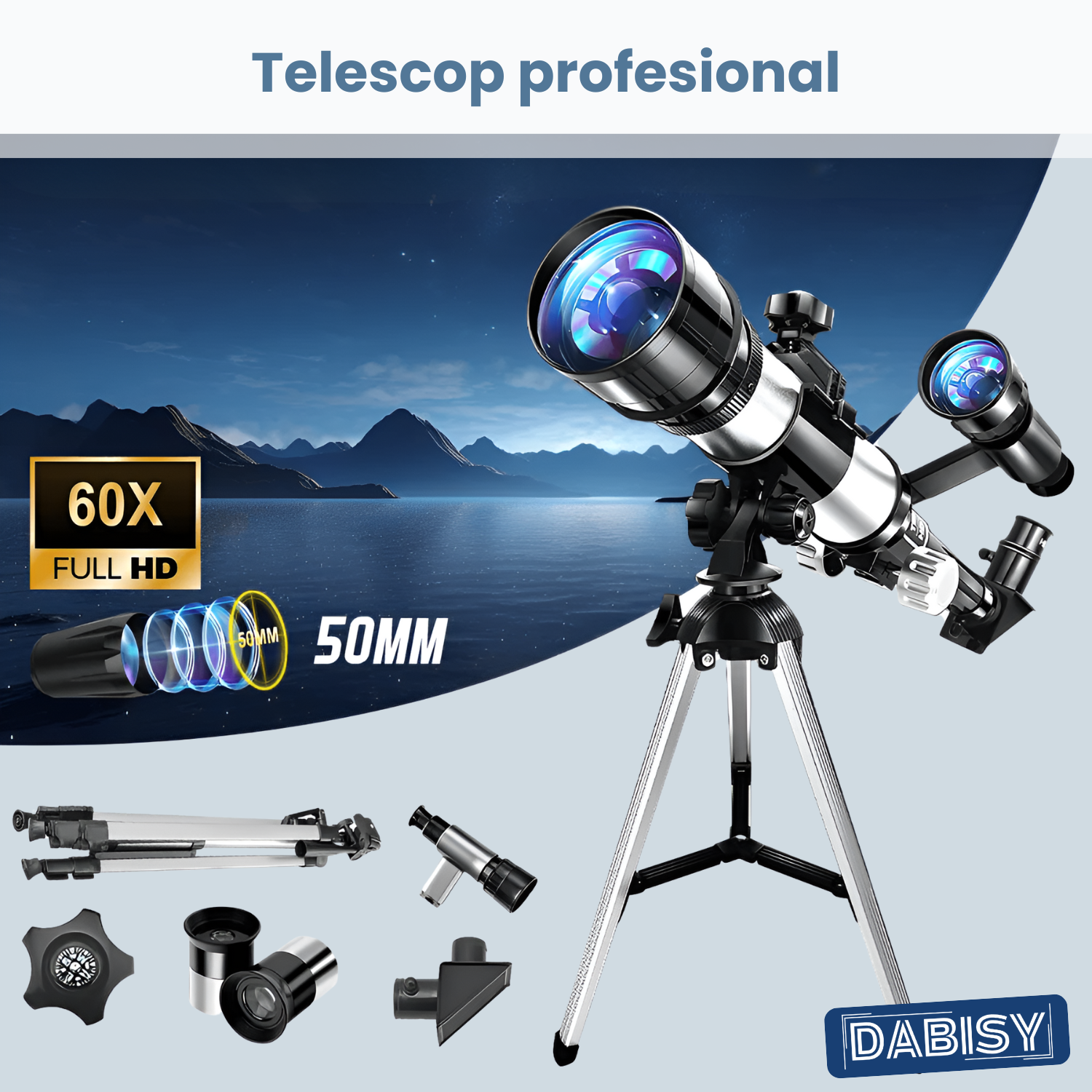 Trepiedul reglabil din aluminiu poate fi extins pana la aproximativ 110 cm, oferind o inaltime confortabila pentru observatii stabile, iar atunci cand este pliat, are o dimensiune compacta de doar 50 cm, permitand depozitarea sau transportul cu usurinta in geanta inclusa. Greutatea intregului set, inclusiv trepiedul si accesoriile, nu depaseste 2 kg, ceea ce il transforma intr-un companion ideal pentru excursii, calatorii sau sesiuni de observatii in natura.